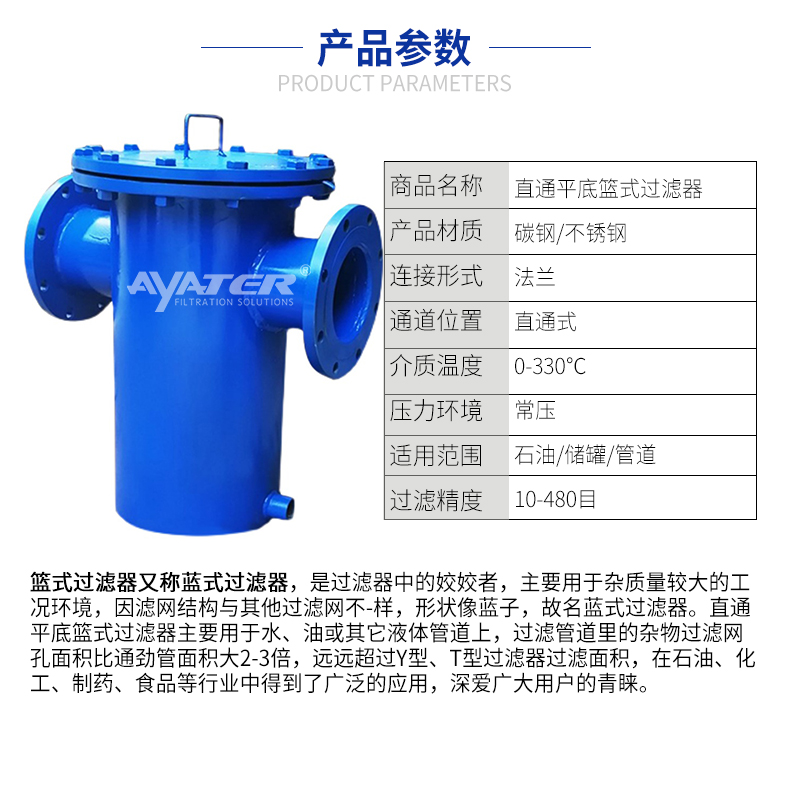 篮式过滤器由***不锈钢304/316制作而成。具有结构新颖,操作简便灵活,过滤面积大,过滤速度快,不堵塞的特点。